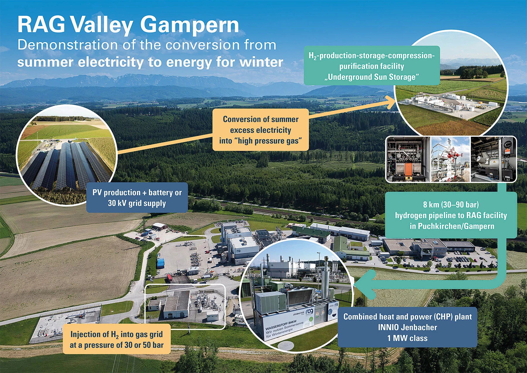 At RAG Valley Gampern, RAG Austria represents the entire cycle of a renewable and supply secure energy system – from the generation of solar summer electricity, through conversion and storage as hydrogen, to flexible reconversion in a controllable combined heat and power (CHP) plant.